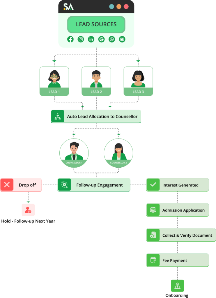 Prevent missed opportunities by assigning the appropriate leads to the suitable admission counsellors, considering the parent's interest. This auto allocation can be